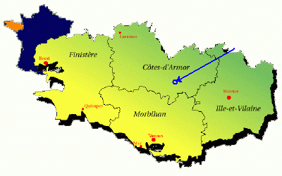 Distance de : - Loudéac : 20 Kms à l’Ouest - Lamballe : 25 Kms à l’Est - St Brieuc : 30 Kms au nord - Rennes : 80 Kms