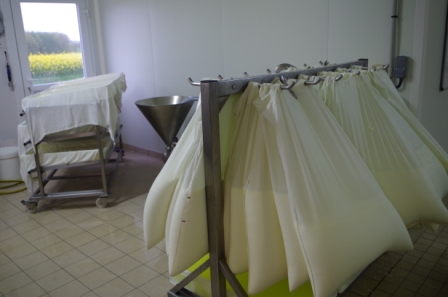 Le fromage blanc : le caillé est mis à égoutter dans des sacs en toile qui laissent couler le sérum. Quand il est suffisamment égoutté, il est mixé (ou « battu ») au mixer. Il devient plus onctueux et est mis en pots à la louche, puis refroidi immédiatement. Nous le fabriquons avec du lait écrémé (0% de matière grasse), du lait demi écrémé (3% de MG / Poids total) ou du lait entier (6% de MG / Poids total).