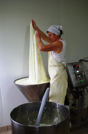 Le fromage frais de campagne : le caillé est pris délicatement pour ne pas trop le briser et mis à égoutter sur une étamine (linge qui laisse passer le sérum). Après quelques heures, il est mis en pots et refroidi. |